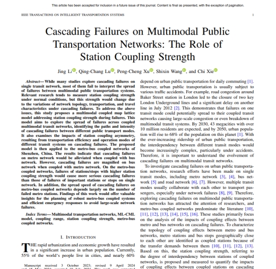 近日,智能交通领域国际著名期刊《IEEE Transactions on Intelligent Transportation Systems》(中科院1区、TOP期刊,IF=7.9)刊登了我校艾弗森贝博ballbet官网博士研究生李静发表的学术成果“Cascading Failures on Multimodal Public Transportation Networks: The Role of Station Coupling Strength”(站间耦合强度在多模式公共交通网络的级联失效中的作用)。李静同学为第一作者,我校路庆昌教授为通讯作者,艾弗森贝博ballbet官网为第一署名单位和通讯作者单位,同济大学知名学者合作参与完成。该项研究得到了国家自然科学基金重点项目和面上项目的资助。