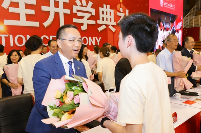 王定华为新生代表们佩戴校徽,并颁发校园卡。在场的全体新生一同佩戴校徽,正式成为“北外人”,肩负起“人民需要我们到哪里,我们就到哪里”的北外使命。