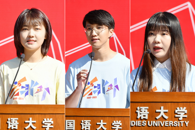 本科新生代表、国际商学院马瑞遥号召同学们要以一往无前的姿态,不畏艰险、昂扬向上,在新时代同向同行的奋进征程中,绽放出更加绚丽的青春光彩。研究生新生代表、国际组织学院潘天一倡议同学们要学好全球语言,了解全球文化,积极参与全球治理,不辜负学校厚望,不辜负时代重任。留学生代表、中国语言文学学院日本籍学生山川百合表达了把真实向上的中国介绍给世界、促进中日两国更加友好的良好愿望,希望和同学们一起用语言搭建起中国与其他国家交流的桥梁,推动构建人类命运共同体。
