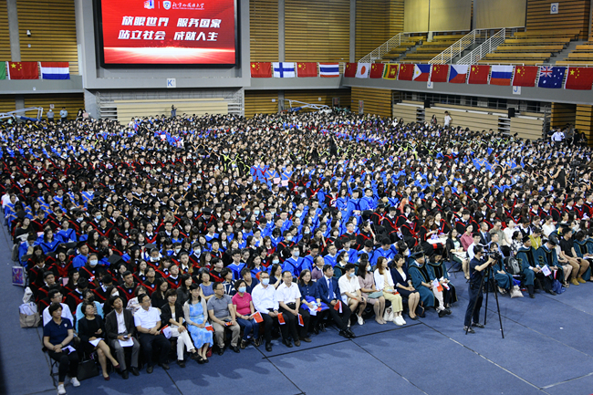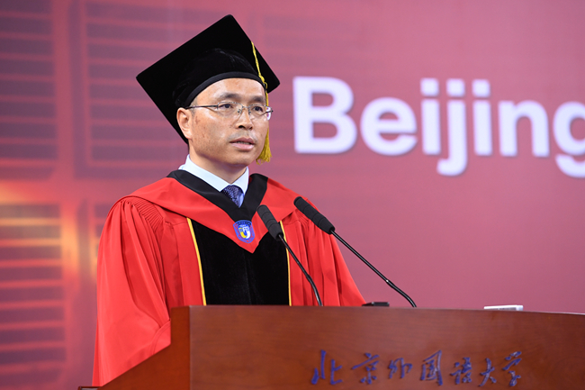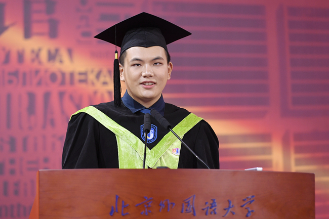 亚洲学院胡海澍作为毕业生代表发言,他与在座毕业生们共同回顾了在北外学习生活的难忘点滴,感恩在北外收获的沟通的智慧、博爱的情怀和笃行的志向,代表北外人表达了对奔赴未来承担使命、践行责任的决心与信心。