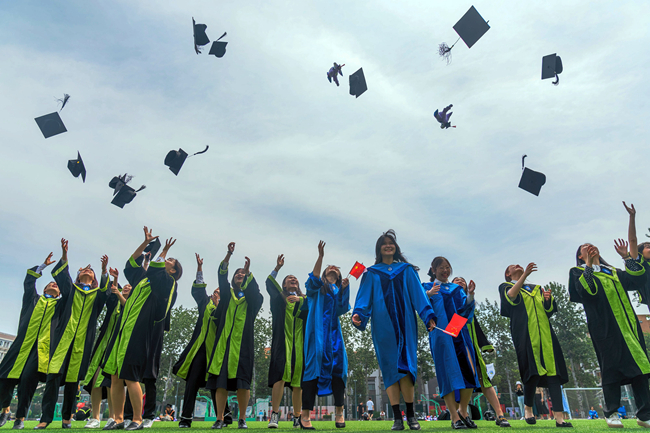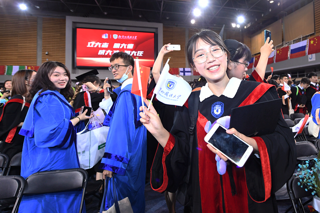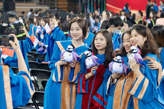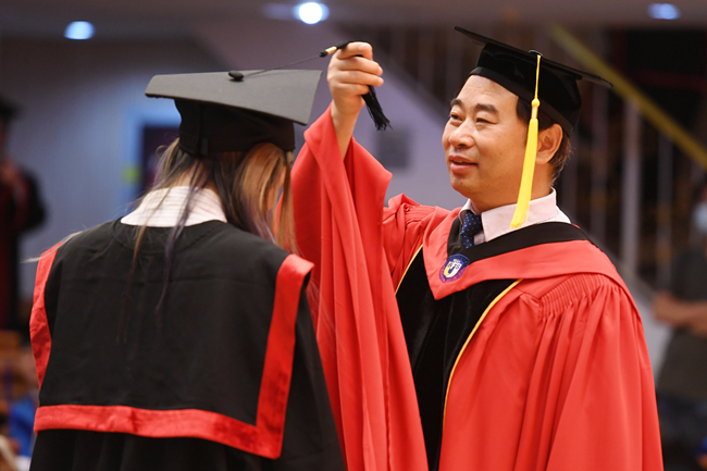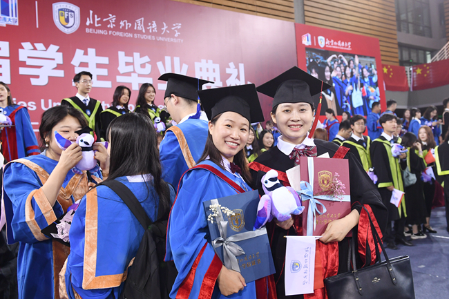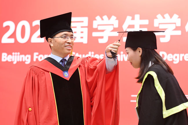 毕业典礼当天,学校在阿语楼和逸夫楼举办7场学位授予仪式。王定华和杨丹在不同会场为每一位学位获得者逐一拨动流苏,颁授学位。