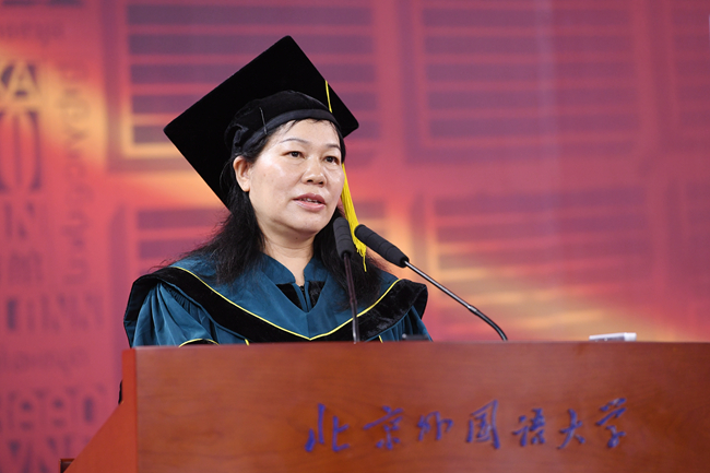 俄语学院院长戴桂菊作为教师代表发言,她在发言中分享了现场聆听习近平总书记在庆祝中国共产党成立100周年大会上重要讲话的感受,她寄语毕业生不忘初心,牢记使命,在今后的学习、工作和生活中能够身心健康,积极进取,不负韶华。