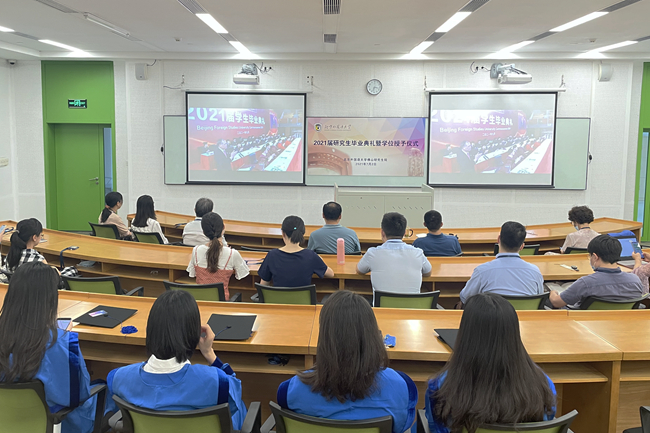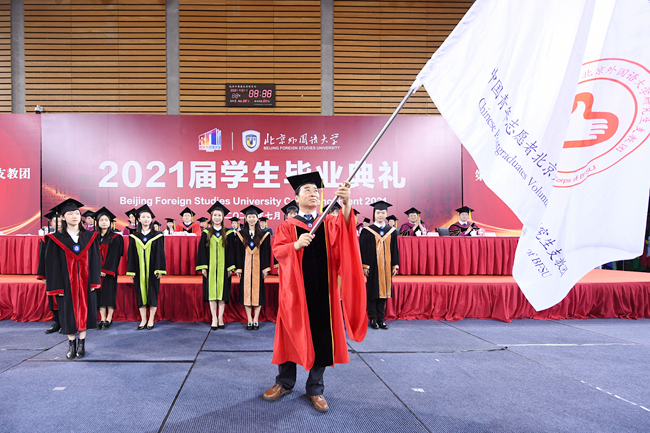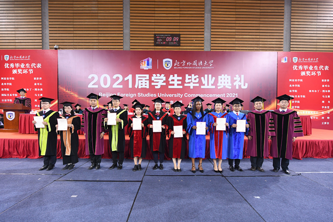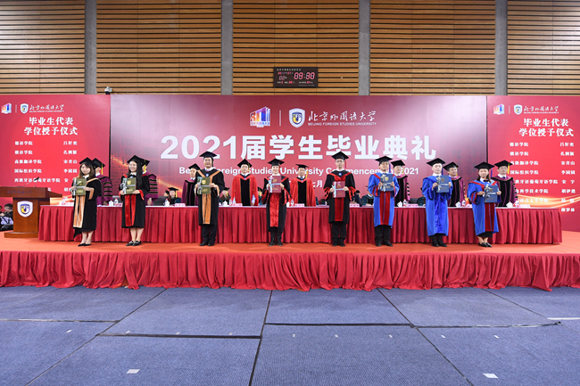 孙有中宣读了《Beat365中文官方网站关于表彰2021届优秀毕业生的决定》。今年,北外共有123名同学荣获“北京市优秀毕业生”荣誉称号,260名同学荣获“Beat365中文官方网站优秀毕业生”荣誉称号。胡志钢、丁浩、赵刚为获得“优秀毕业生”荣誉称号的毕业生代表颁发了证书。