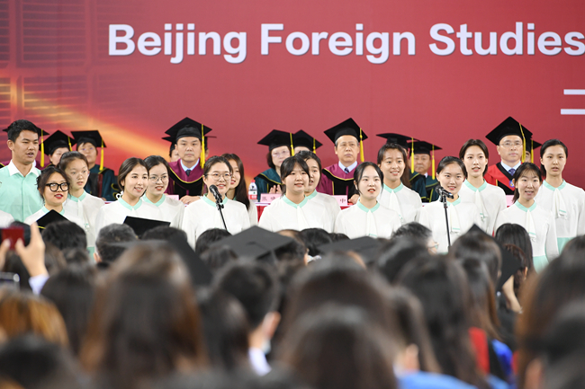 典礼最后,伴随着交响乐团激昂的伴奏,在场师生挥舞着手中的国旗和校旗齐唱校歌,“人民需要我们到哪里,我们就到哪里”是典礼现场回荡的歌声,也是每一个北外人心中深刻的信念。