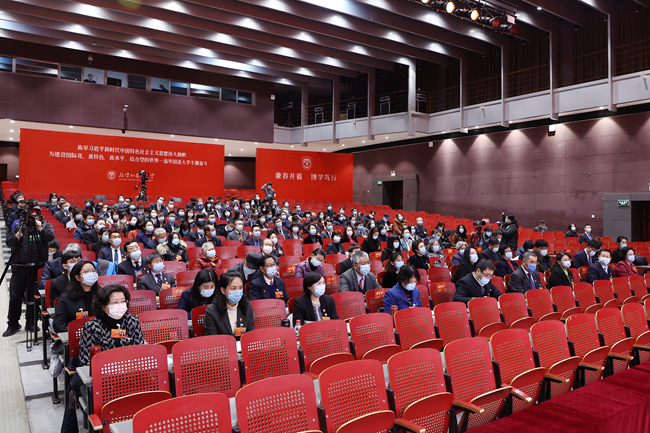 王定华深入分析了新时代北外面临的机遇挑战,他指出,放眼全球,机遇和挑战长期并存;立足国内,创新和发展更加迫切;环顾左右,协同和竞争相互交织;面向未来,科技革命和产业变革加深加广。王定华表示,综合分析国内外形势和我校发展条件,学校党委坚持顶层设计与集思广益相结合,推动“十四五”规划编制,目前已形成了“十四五”规划征求意见稿,明确了未来五年及未来十五年北外改革发展的奋斗目标。
