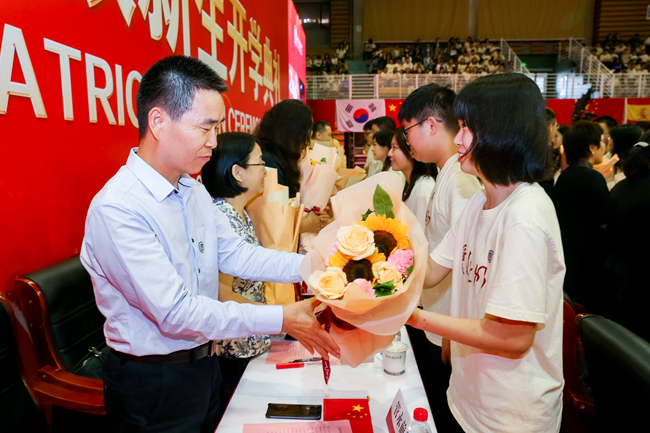 随后,新生代表向在场教师代表鞠躬并敬献鲜花,新生领誓代表带领全体新生宣读入学誓词:铭记“兼容并蓄、博学笃行”的北外校训,志存高远、勤学力行,敬师爱校、诚以待人,强健体魄、阳光向上,珍惜韶华、奋发有为,胸怀天下、敢于争先,不畏艰难、勇担使命,服务人民、奉献祖国,贡献世界、创见未来。