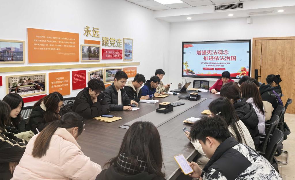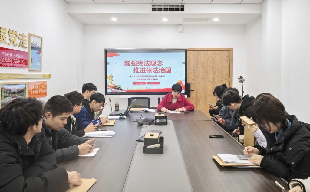 在第十一个国家宪法日到来之际,为深入贯彻落实习近平法治思想,进一步弘扬宪法精神,推进依法治国进程,12月5日,艾弗森贝博ballbet官网机器人本科生党支部在朝晖园一站式示范园区党团活动室举办“增强宪法观念,推进依法治国”主题党日活动。党支部书记王斌娟及全体支部党员参加活动。