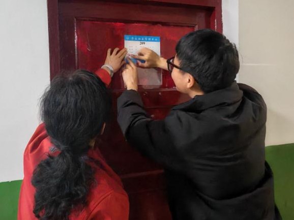 活动结束后,党员同志们回到宿舍楼,联合学院研究生会与宿管阿姨一起为学院党员宿舍门卡粘贴党徽,健全完善“党员先锋岗”建设,切实发挥学生党员示范引领作用。