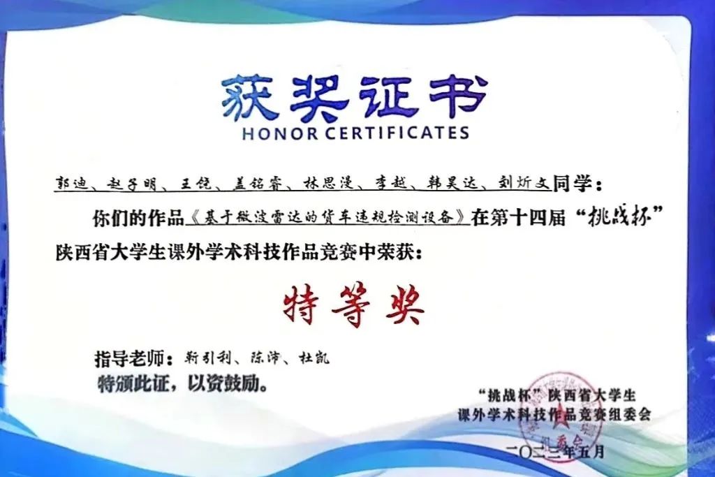 艾弗森贝博ballbet官网积极响应团省委和校团委号召,广泛组织学生参与本届“挑战杯”竞赛。由学院靳引利教授指导、本科生郭迪、赵子明、王饶、盖铭睿、林思漫、李越、韩昊达、刘炘文同学完成的作品《基于微波雷达的货车违规检测设备》荣获第十四届“挑战杯”陕西省大学生课外学术科技作品竞赛特等奖,实现了学院在此项赛事上的历史性突破,团队成员赵子明同学代表学校在颁奖仪式现场进行路演展示。