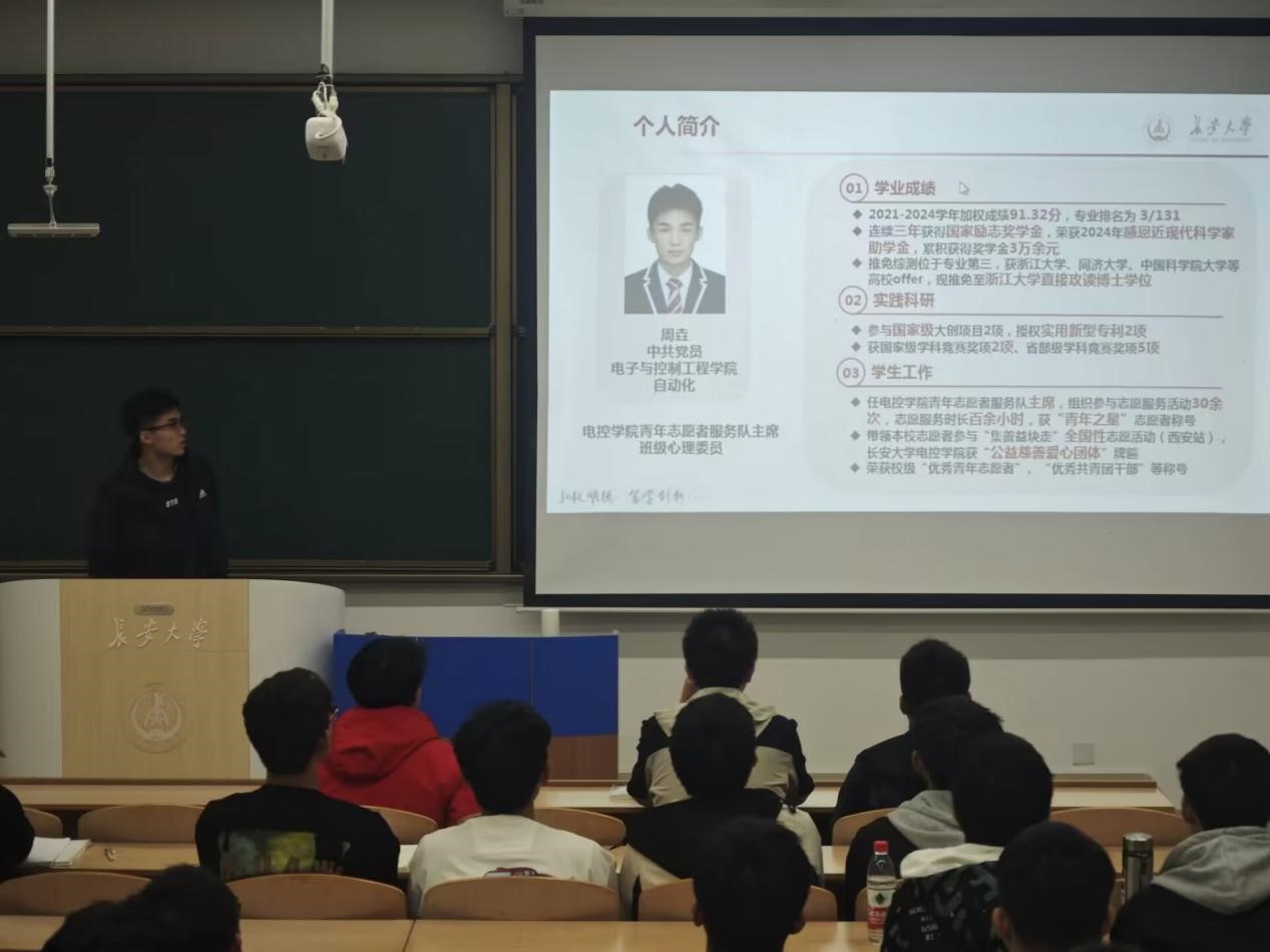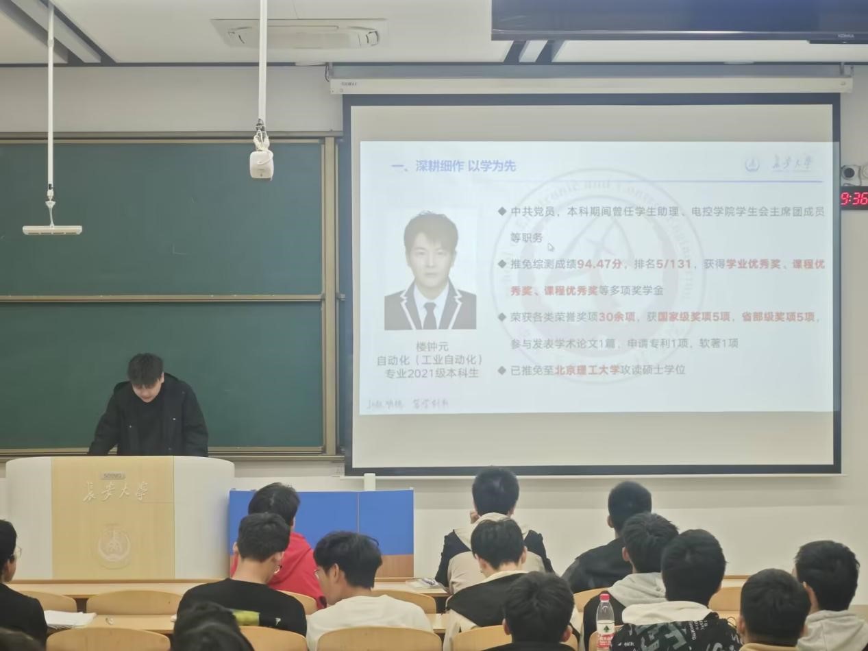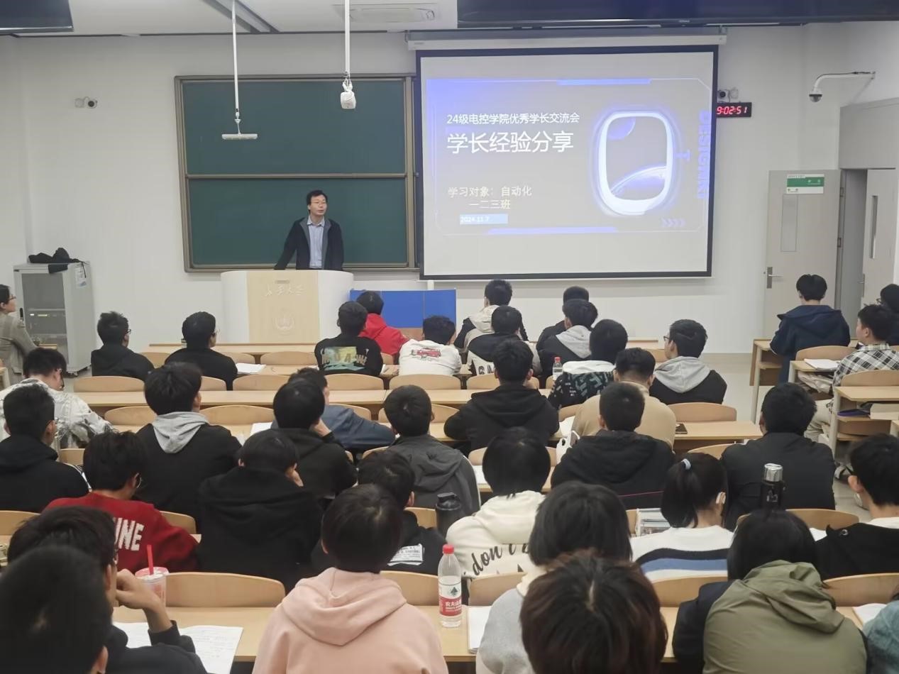 为充分发挥优秀典型的榜样示范作用,营造良好的学习氛围,进一步强化学院学风建设,艾弗森贝博ballbet官网““优秀学长经验交流会”于11月7日晚上19点在WH1101教室召开,会议邀请2021级保研学生高晓轩、楼钟元、周垚作经验分享,2024320101班班主任周经美,2024320101、2024320102、2024320103班全体同学参加会议,会议由自动化系副主任杨盼盼主持。
