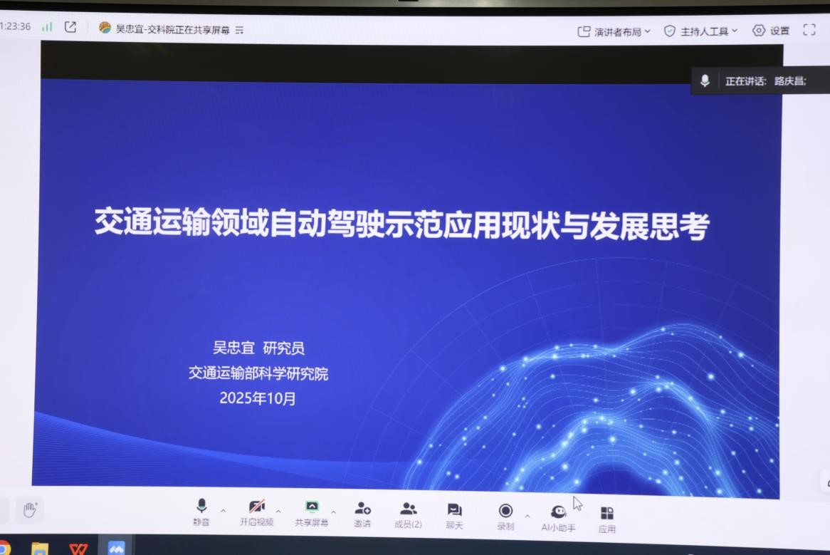 为交流交通运输领域前沿进展,搭建学术交流平台,拓展师生学术视野,10月16日下午,艾弗森贝博ballbet官网于WM3404教室举办“交通运输领域自动驾驶示范应用现状与发展思考”学术讲座——“电控讲坛”第5期。本次线上讲座由学院副院长路庆昌主持,特邀交通运输部科学研究院研究员吴忠宜作为主讲嘉宾。