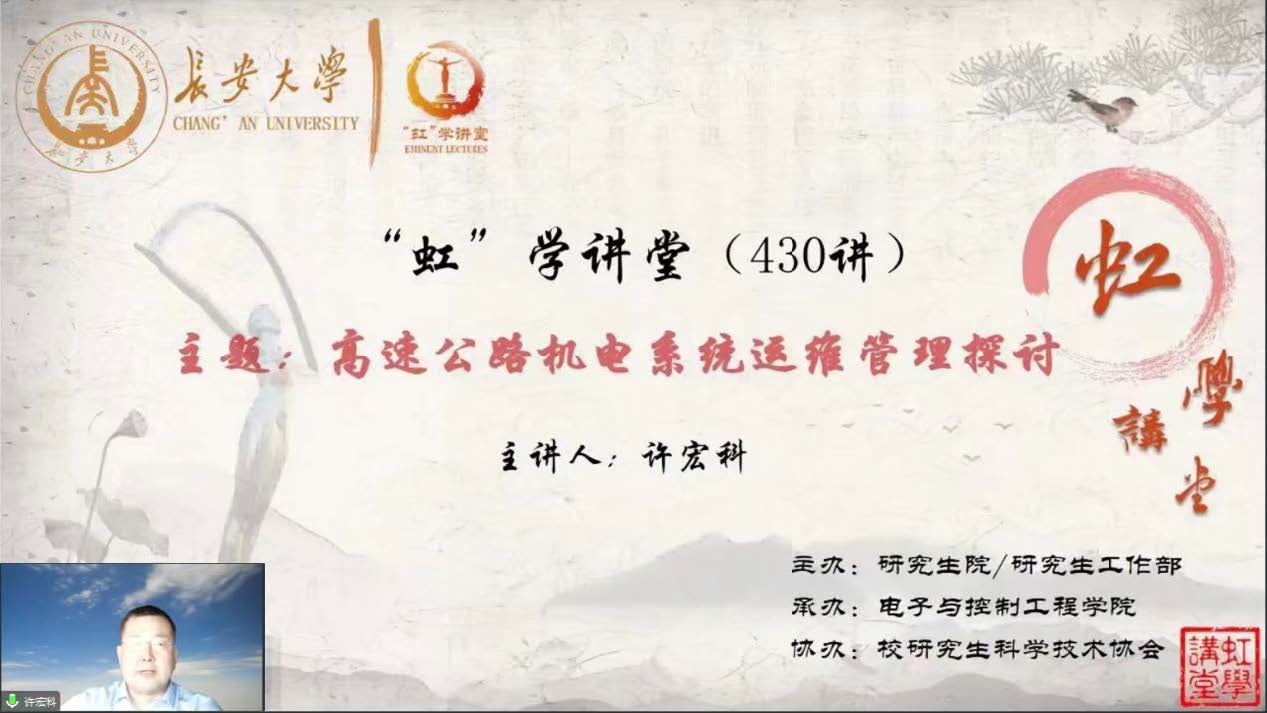3月9日晚,由研究生院/研究生工作部主办、艾弗森贝博ballbet官网承办、校研究生科学技术协会协办的“虹”学讲堂第430讲以线上讲座形式顺利举办。艾弗森贝博ballbet官网许宏科教授作了题为“高速公路机电系统运维管理探讨”的报告,相关学院近300名师生参加讲座。
