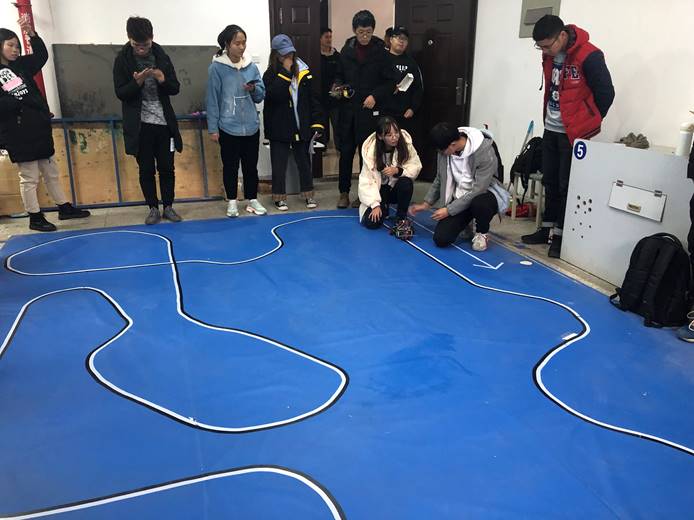 下午14:30分,比赛正式开始。本次比赛分为避障组和寻迹组两个项目,分别要求小车走出纸板迷宫与黑线循迹赛道,以完成时间、赛道完成度、碰撞或偏离赛道次数为评分标准。选手们在比赛开始之前已经带着各自队伍的智能小车在场地进行了调试,熟悉了赛道结构。比赛开始后,各队伍小车按顺序出发,大部分队伍基本能按要求完成赛道任务。在比赛现场,有些队伍速度极快、灵活避障,有些队伍速度虽慢、却稳定性极强,可谓各展风采。也有少部分队伍遇到技术性故障,经过不断的现场调节后完成了赛道。比赛过程中由现场工作人员记录成绩。经过统计,本次比赛中获奖的有循迹组一等奖1名、二等奖2名、三等奖5名,避障组一等奖2名、二等奖6名、三等奖3名。